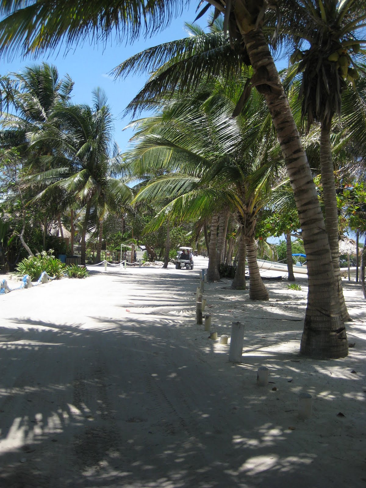 The road once you cross the bridge is dirt and the farther you drive, the worse the roads get. It is a good bike ride (you can ride on the beach for miles and miles) or golf cart ride for a mile or two…and then the roads start to get ugly. Most people take the water taxi from town to the resorts up north. (http://www.coastalxpress.com/)