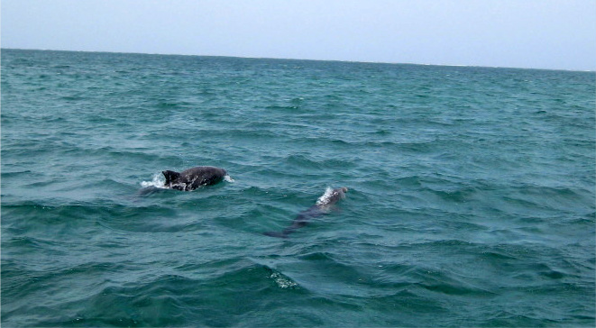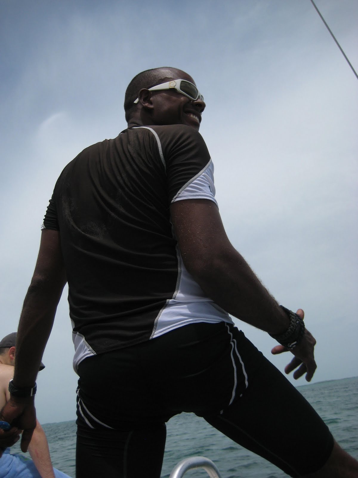Willie (in this crazy outfit) spotted some dolphins and whipped the boat right around.