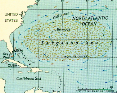 The Sargasso Sea is an area in the middle of the North Atlantic Ocean surrounded by ocean currents. The gulf stream and various currents are its “shores” and it is a swirling mass of sea weed and all of the trash (called the “Great North American Garbage Patch”) that the currents carry. It’s also home to the seaweed called sargasso (single: sargassum) that rises to the surface in huge quantities…it has been called a floating city. It’s not just a bad thing…baby sea turtles use this area and the seaweed cover for protection so they can grow big and strong.