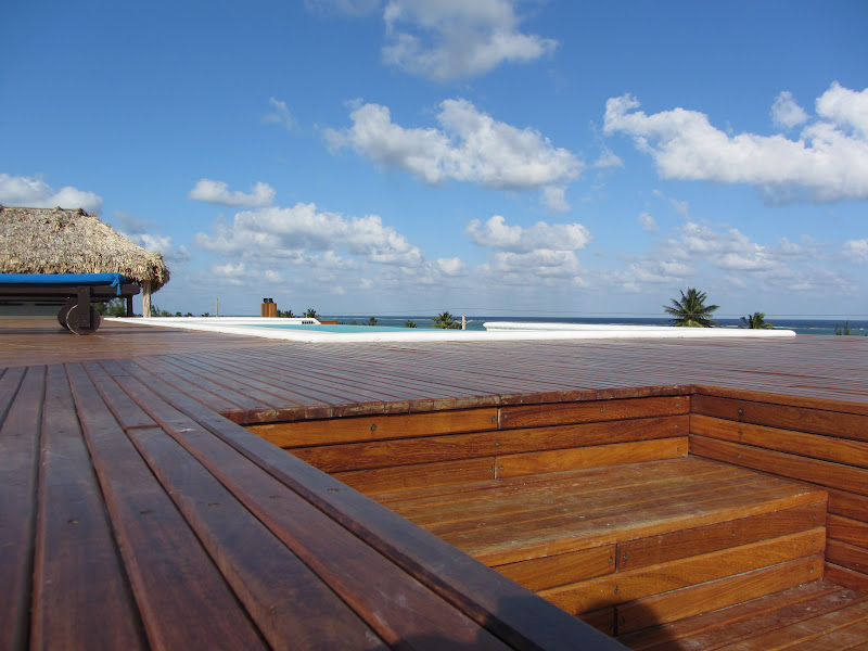 And then up to the roof deck on floor number four. A bar, an infinity pool with a beautiful teak patio, lounging beds, lots of bathrooms and showers, seating areas and a perfect view over the Tres Cocos section of the reef.