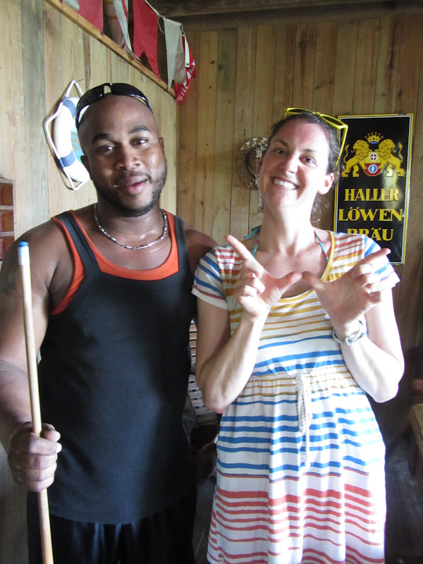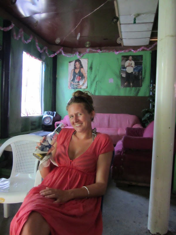 Look at the decor. I felt like I was in a frat house…love the cds hanging from the ceiling and the posters of Lil Kim and Nelly. Here is Danni enjoying a cold Barena. We were at this bar more than once during our two day trip to Guanaja.